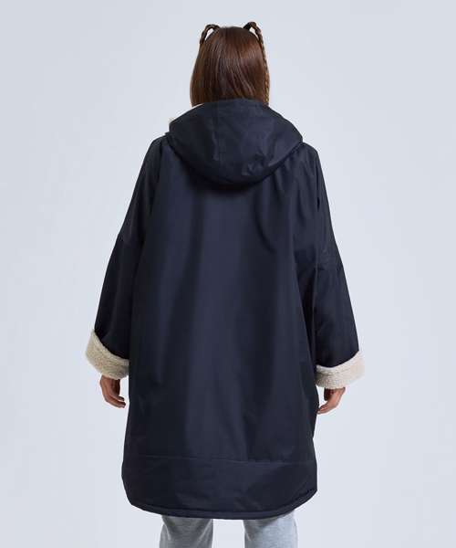 Unisex. Oversized. Full-length two-way plastic zip with easy pull toggles. Chin guard. Oversized fit. Side vents. Adjustable cuffs with hook and loop fastening. Side zip pockets. Inside pocket with zip on the left side. Inside patch pocket on the right side. 3-panelled hood. Loop on the centre back of the jacket for hanging the robe. Dropped back hemline. (5000/5000 waterproof and windproof). Embroidery access to the back and chest area can be accessed through here. Waterproof taped seamed outer layer. Sherpa fleece interior. Rebrandable stuff sack carry bag with double drawstring straps. CE Class 1 Certified.